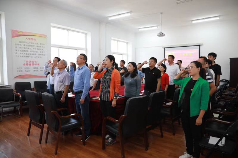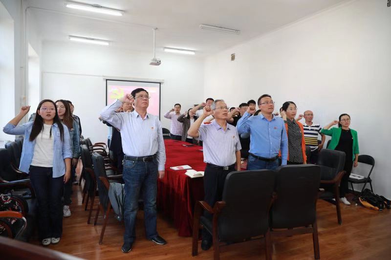 师生党员三十余人参加了此次活动。本次活动包括“唱国歌”、“重温入党誓词”、“歌唱我和我的祖国”、“学习强国”等四个部分。全体师生党员饱含热情歌唱祖国、祝福祖国。在学习环节,院党委书记宋子岭带领全体党员认真学习了《习近平总书记在“不忘初心、牢记使命”主题教育工作会议上的重要讲话》和《深入学习习近平总书记关于力戒形式主义官僚主义重要论述和政绩观教育》等内容。