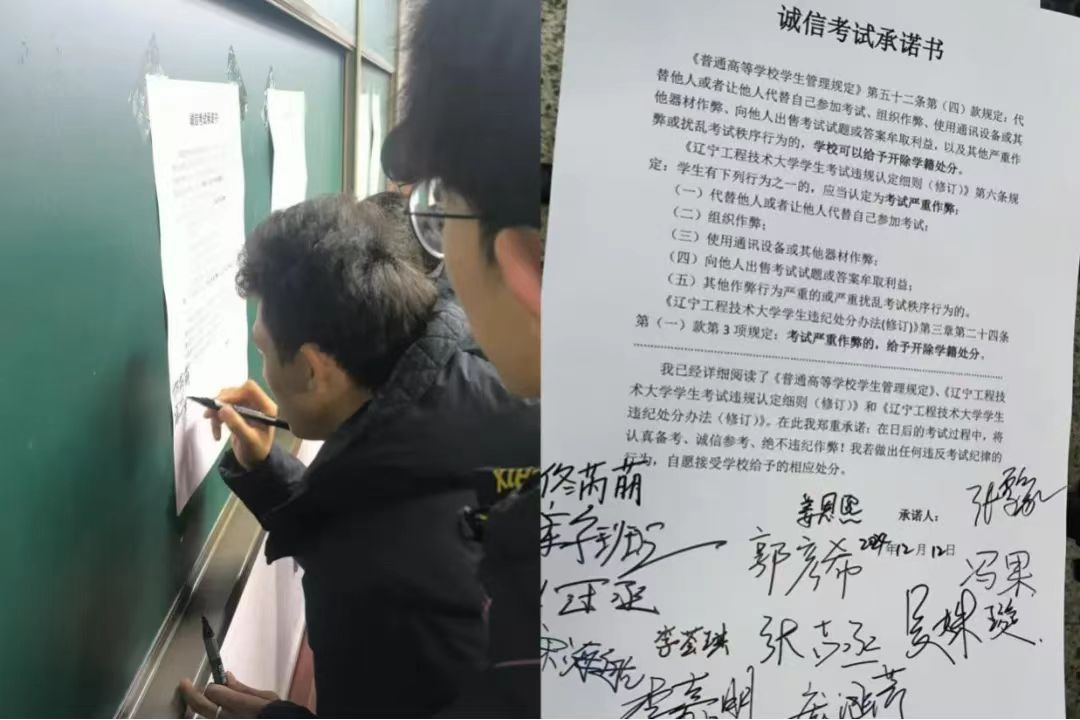 我已经详细阅读了《普通高等学校学生管理规定》、《辽宁工程技术大学学生考试违规认定细则(修订)》和《辽宁工程技术大学学生违纪处分办法(修订)》。在此我郑重承诺:在日后的考试过程中,将认真备考、诚信参考、绝不违纪作弊!我若做出任何违反考试纪律的行为,自愿接受学校给予的相应处分。