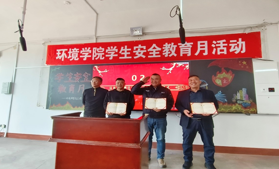 聘任校园安全导师仪式和党委保卫部聘任校园安全宣传员仪式,赵晓亮院长为聂仁东老师、郭忠宇老师、 刘海涛老师颁发校园安全导师聘书。郭忠宇老师、刘海涛老师为马郡遥等六位同学颁发校园安全宣传员聘书。